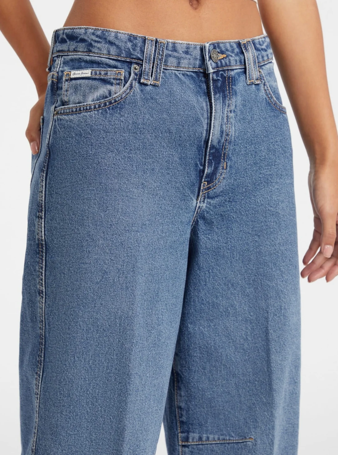 Make everyday styling effortless with the Guess Jeans Mid-Rise Barrel Jeans in Medium Wash. Designed with a modern barrel-leg silhouette, this mid-rise style features a relaxed shape through the leg and classic five-pocket construction for an authentic denim look. Crafted from cotton denim with a hint of stretch, it delivers the perfect balance of structure and comfort for everyday wear.